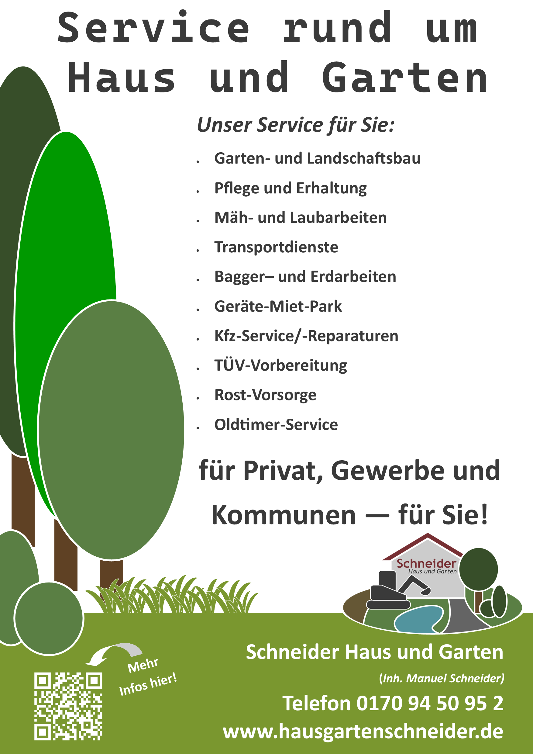 Haus und Garten Schneider nun präsent im WorldWideWeb. Alles rund um unsere Dienstleistungen finden Sie jetzt auf diesen Seiten, welche wir stetig ausbauen möchten. Wir freuen uns, mit Ihnen arbeiten zu dürfen!